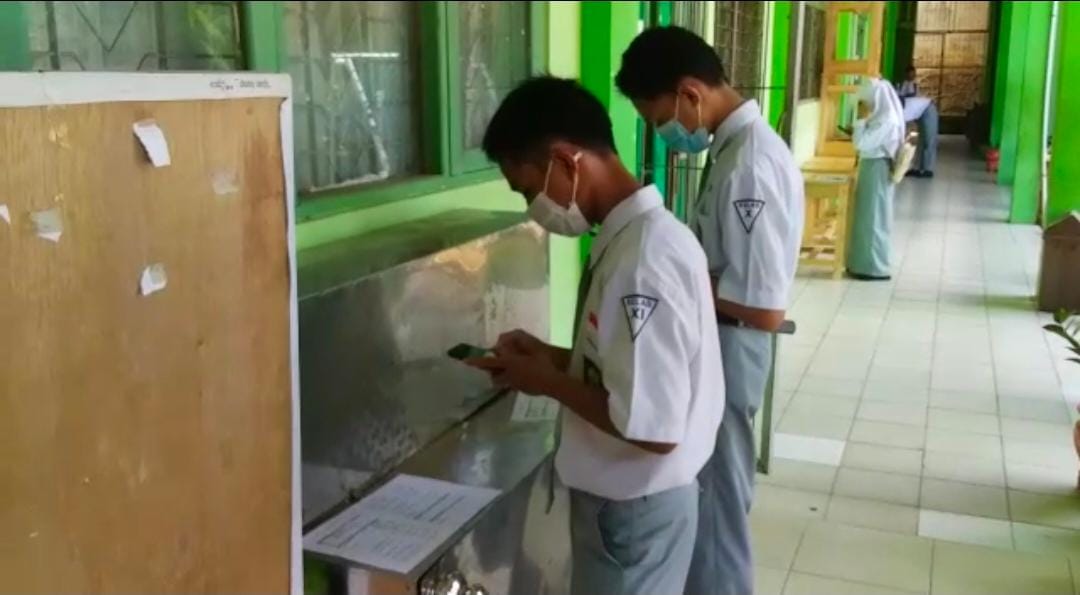 Banjarbaru, DUTA TV — Sambil bersandar di tiang, Wahyu orang tua salah satu siswi SMAN 1 Banjarbaru terlihat gelisah sambil mengutak atik telepon seluler, untuk menghubungi call center peduli.Covid indonesia.