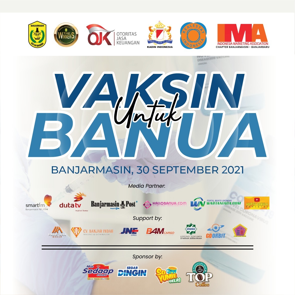 Banjarmasin, DUTA TV — Dalam rangka memutus rantai penularan covid-19, dan mewujudkan percepatan herd imunnity, adaptasi sosial serta pemulihan ekonomi masyarakat melalui program vaksinasi, IMA bekerjasama dengan OJK Regional 9 Kalimantan, Kadin dan REI Kalsel menyelenggarakan “Vaksin Untuk Banua” yang diselenggarakan secara serentak di 10 Puskesmas yang ada di Kota Banjarmasin, pada Kamis 30 September 2021 dengan pusat acara peresmiannya di Puskesmas Sungai Bilu Banjarmasin.