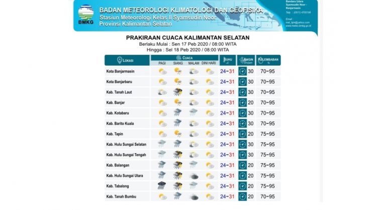 DUTA TV BANJARMASIN –  Diinformasikan beberapa wilayah di Kalimantan Selatan hari ini, Senin (17/02) masih akan mengalami kondisi cuaca cerah berawan, terutama di pagi dan siang hari. Meskipun petir dan angin kencang juga perlu diwaspadai.