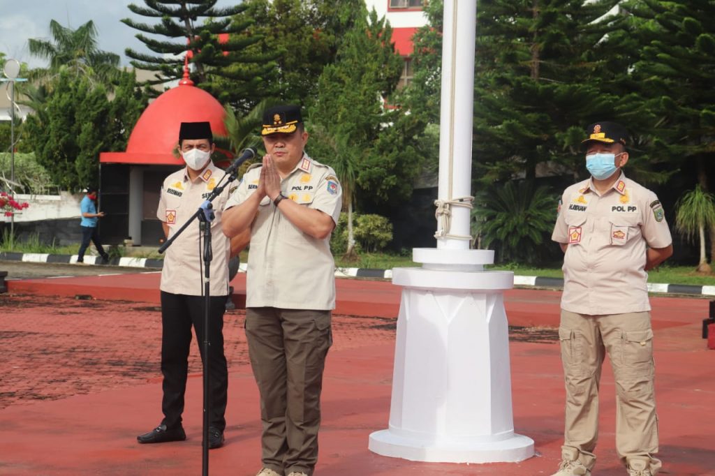 Oleh Sebab itu Pemerintah daerah hadir yakni salah satunya Satpol PP selalu bersama-sama dengan masyarakat sebagai Garda terdepan sebagai benteng terdepan sebagai perisai terdepan melaksanakan protokol kesehatan.