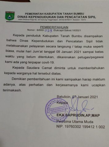 Penghentian sementara pelayanan secara tatap muka yang dilakukan Dinas Kependudukan dan Catatan Sipil Tanah Bumbu dikarenakan adanya petugas yang terpapar Covid-19.