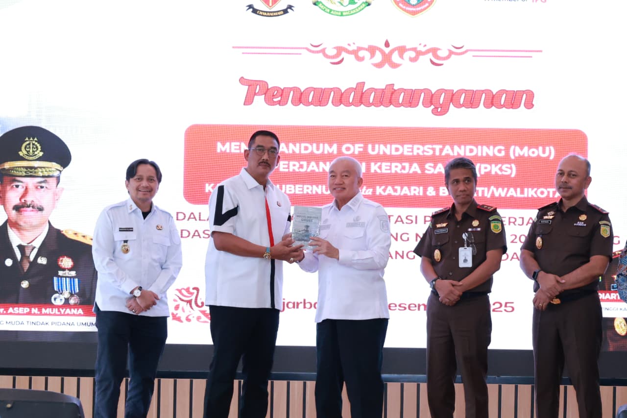 Banjarbaru—dutatv.com, Upaya memperkuat kepastian hukum dalam pelaksanaan pembangunan di Kalimantan Selatan kembali ditegaskan melalui penandatanganan Memorandum of Understanding (MoU) dan Perjanjian Kerja Sama (PKS) antara Gubernur H. Muhidin dan Kejaksaan Tinggi Kalimantan Selatan, Tiyas Widiarto yang berlangsung di Aula ST Burhanudin, Kejati Kalsel, Banjarbaru, pada Rabu (10/12/2025) siang.