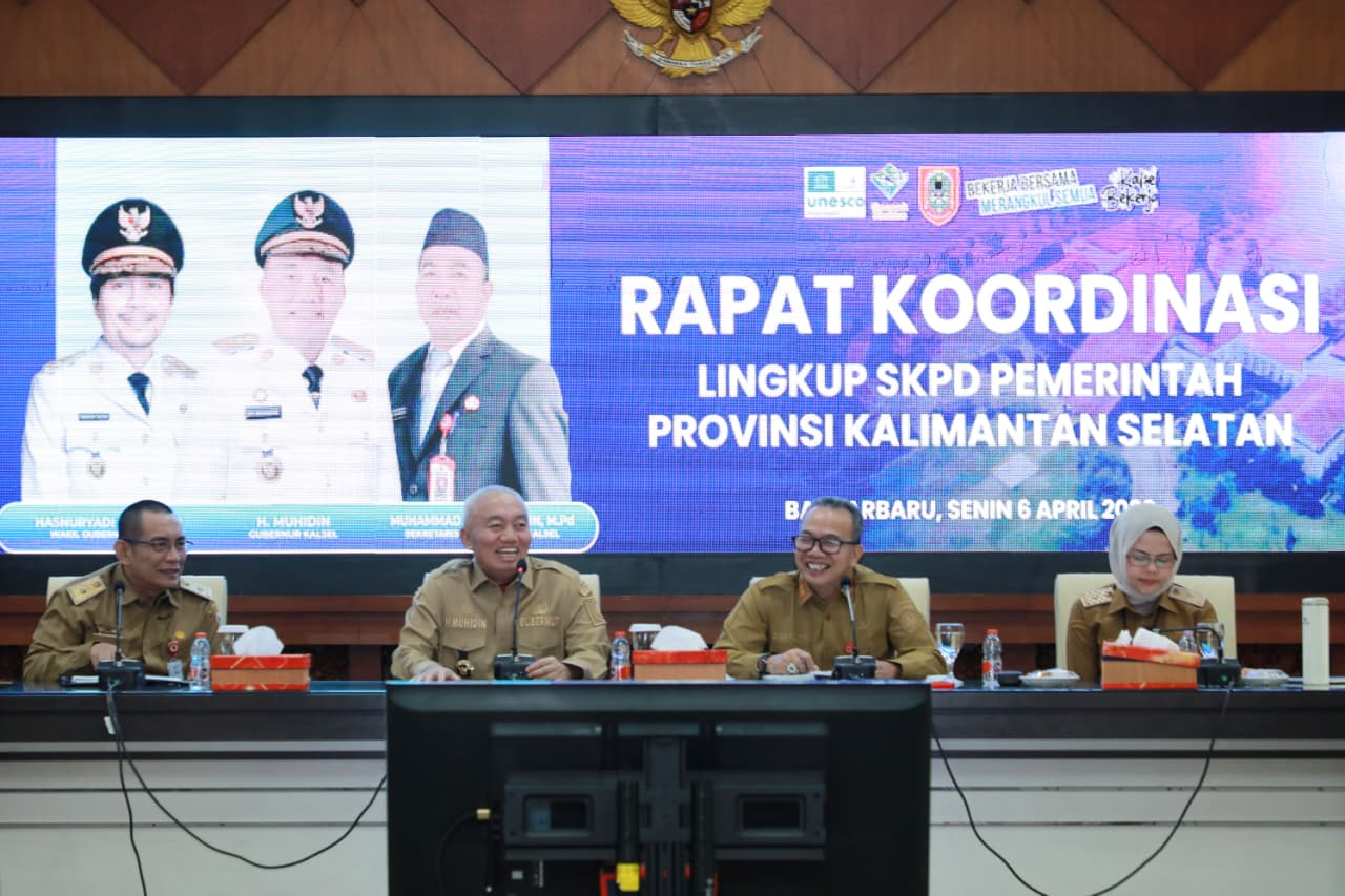 Banjarbaru – dutatv.com, Gubernur Kalimantan Selatan, H. Muhidin didampingi Sekretaris Daerah Provinsi Muhammad Syarifuddin memimpin Rapat Koordinasi Lingkup SKPD Pemerintah Provinsi Kalimantan Selatan terkait realisasi anggaran 2026, di Ruang Rapat Abrani Sulaiman, Senin (6/4/2026).