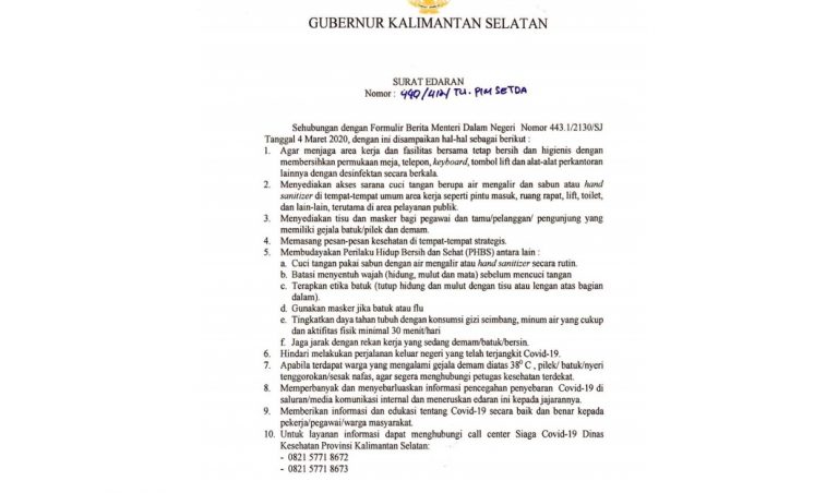 DUTA TV BANJARMASIN – Gubernur Kalimantan Selatan mengeluarkan surat edaran bernomor 440/412/TU.PIM SETDA terkait merebaknya virus corona atau Covid-19. Himbauan ini utamanya menyasar pada lingkungan kerja.