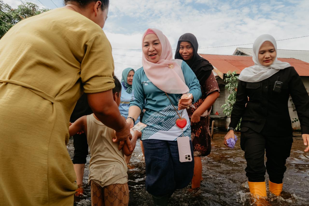 Kehadiran Ketua TP PKK Provinsi Kalimantan Selatan tersebut disambut hangat oleh warga setempat yang merasa terbantu dan diperhatikan di tengah kondisi bencana banjir yang masih melanda wilayah mereka.