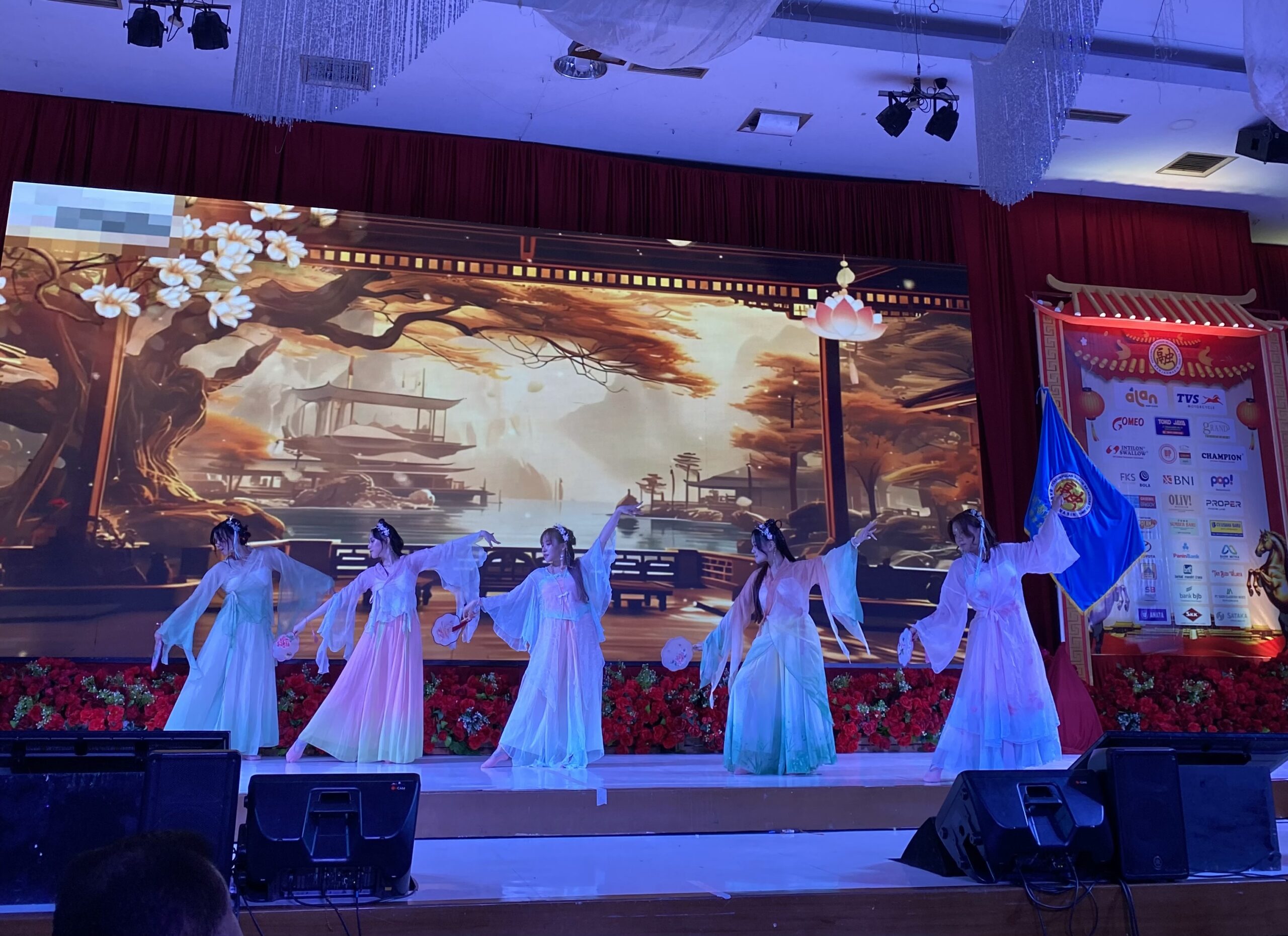 Nuansa merah dan emas mendominasi dekorasi ruangan, mencerminkan warna khas perayaan Imlek. Para undangan tampil dengan busana terbaik, menambah semarak suasana acara.