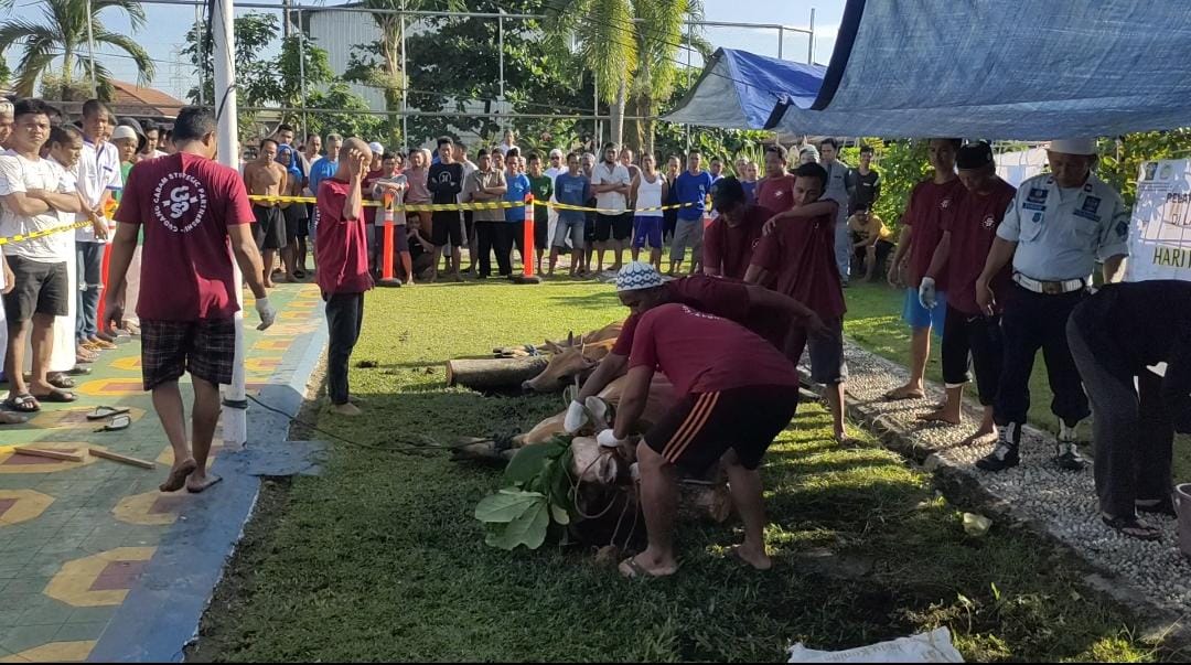 Para warga binaan pun terlihat antusias menyaksikan dan turut serta membantu petugas untuk melakukan pemotongan hewan kurban.