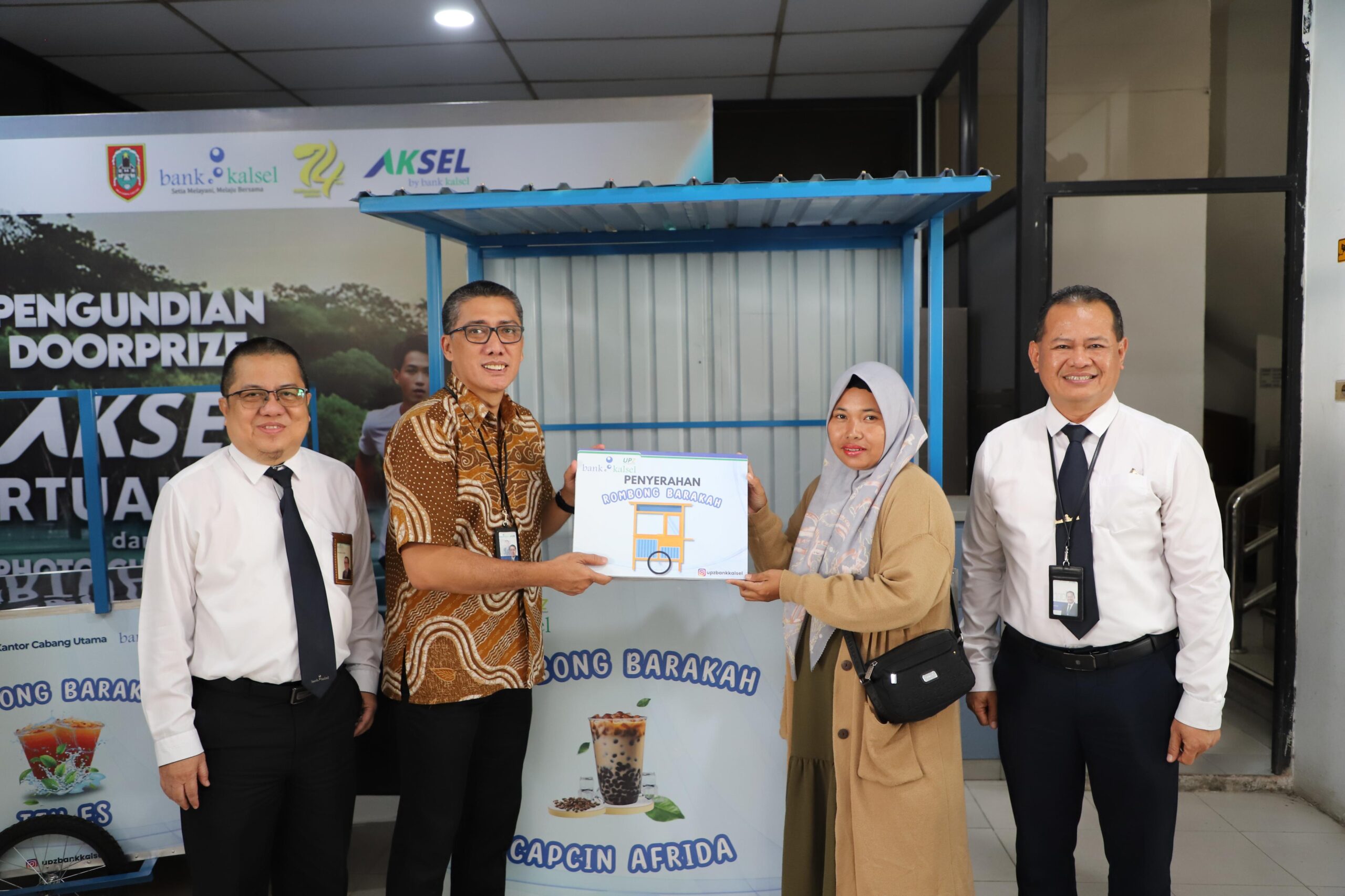 Bantuan ini diserahkan langsung oleh Direktur Utama Bank Kalsel, Fachrudin secara bergantian kepada 3 (tiga) penerima Rombong Barakah yaitu Wahyu Pazeri (Usaha Minuman Es), Andi Chandra (Usaha Onde-Onde), Normawati (Usaha