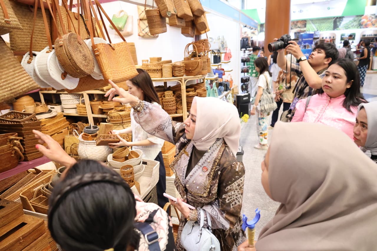 Berbagai produk kerajinan dari Dekranasda Kabupaten/Kota di Kalimantan Selatan dipamerkan, mulai dari kriya, kuliner, hingga wastra khas daerah. Terlihat mengenakan gaun Sasirangan khas Banjar, Hj. Fathul Jannah tengah mengunjungi stan yang menampilkan kerajinan lokal berbahan purun dan rotan, termasuk tas, dompet, dan anyaman lainnya.
