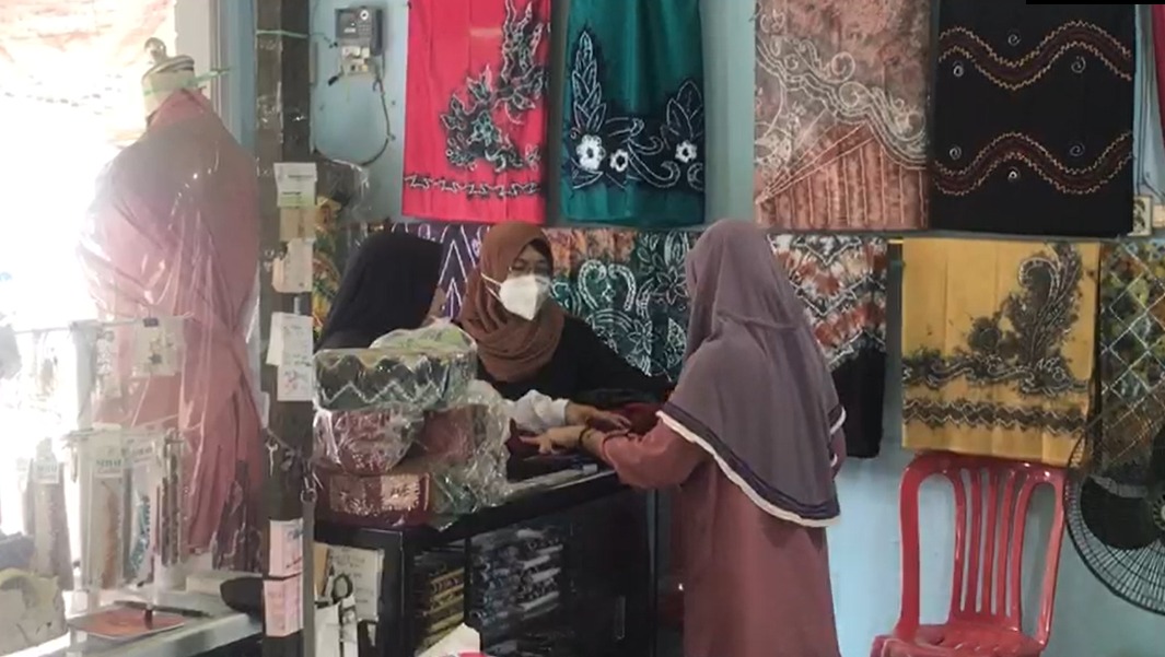 “Yang dijual baju jadi, Laung, macam macam model yang dicari. Di sini standard satu set Laung sama Tapih 250.000 kalo misalkan jubah tidak diproduksi lagi, baju kantoran kisaran 250 yang biasa penjahit menaikkan harga jahit karena produksi”, Ujar Rahmiyati, Penjual Sona Sasirangan