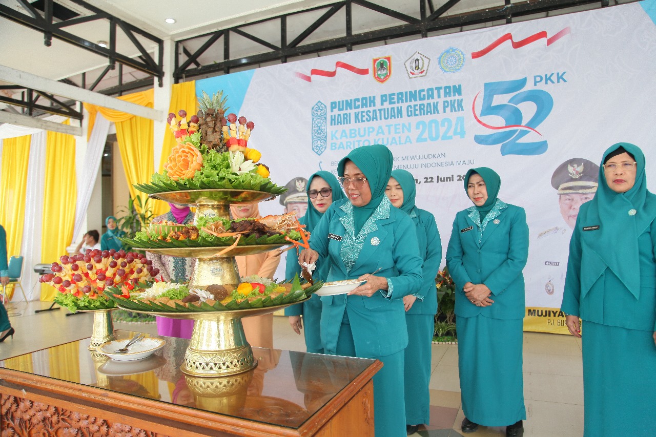 Pj. Bupati Mujiyat diwakili oleh Sekda Batola Ir. H. Zulkipli Yadi Noor, M.Sc dalam sambutan tertulisnya mengucapkan selamat memperingati Hari Kesatuan Gerak PKK ke 52 Tahun pada seluruh kader-kader PKK dimanapun berada.