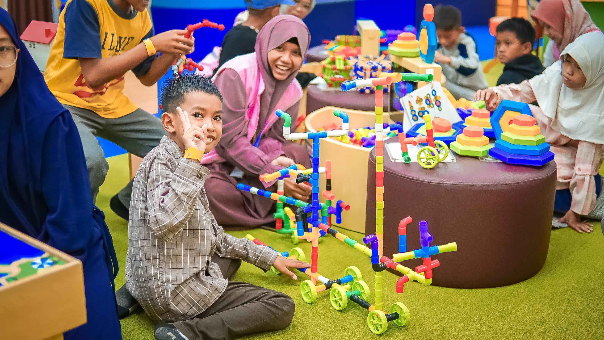 “Baru pertama kali bisa bermain ditempat seperti ini, senang sekali rasanya bisa berkreasi. Permainannya banyak, tempatnya bersih dan dingin, luar biasa senangnya,” ujar Zainuddin sambil menyusun permainan bongkar pasang.