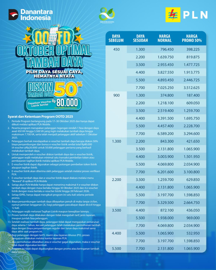 Program ini menawarkan diskon 50% untuk tambah daya listrik, berlaku hingga 30 Oktober 2025.