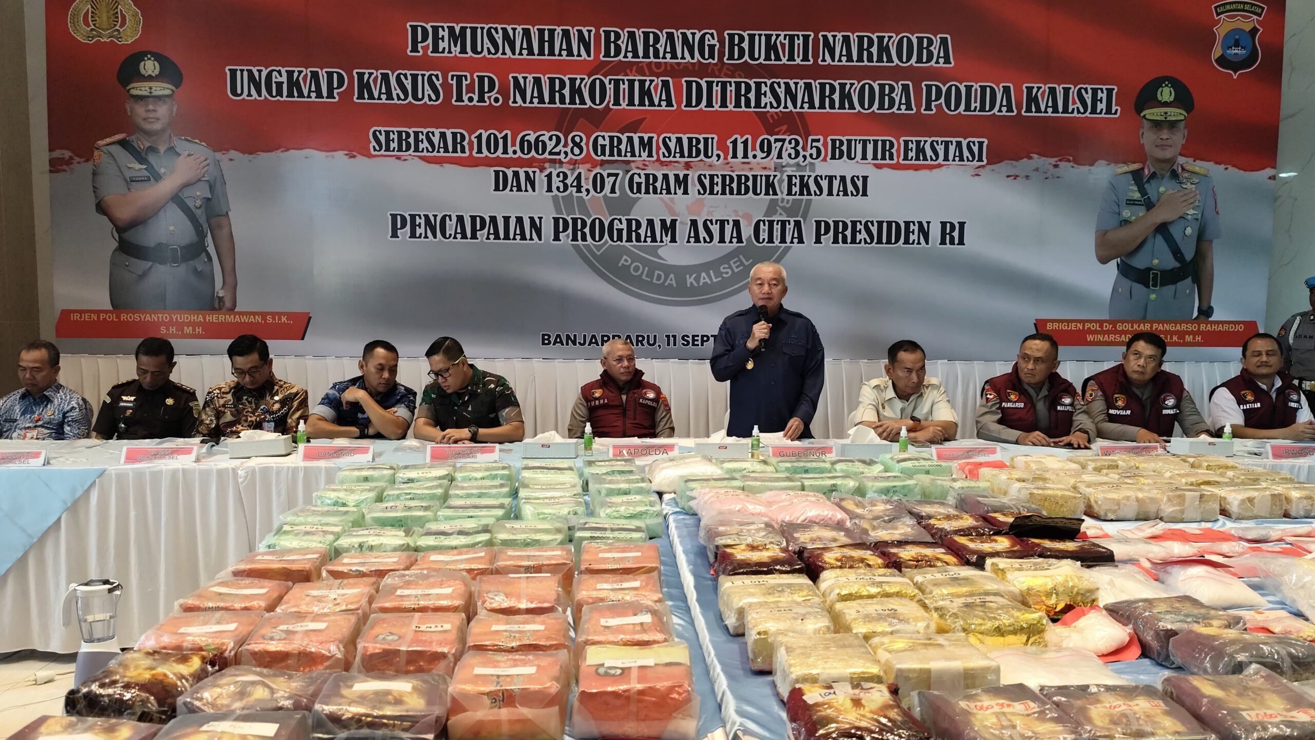 BANJARBARU, DUTA TV — Direktorat Reserse Narkoba Polda Kalimantan Selatan memusnahkan barang bukti narkotika sebesar 101 kilogram sabu-sabu dan 11.973 butir ekstasi hasil pengungkapan kasus tindak pidana narkotika, di lobi Mapolda Kalsel, Banjarbaru, Kamis (11/09/25).