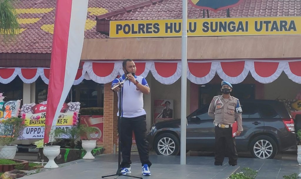 Dalam apel pagi yang dipimpin Wakapolres HSU Kompol Irwan, S.ST,.S.H diikuti Para PJU dan personil Polres HSU, Wakapolres meminta agar seluruh personel menjaga kesehatan dengan berolah raga, untuk membangkitkan imun tubuh agar terhindar dari virus corona.