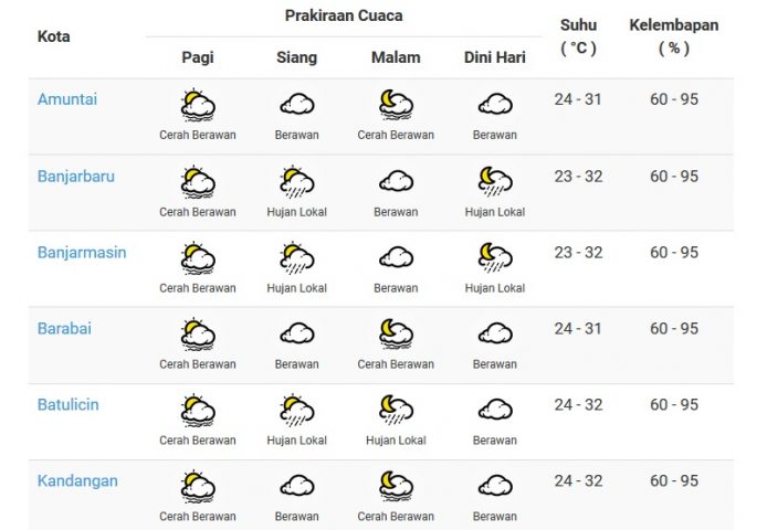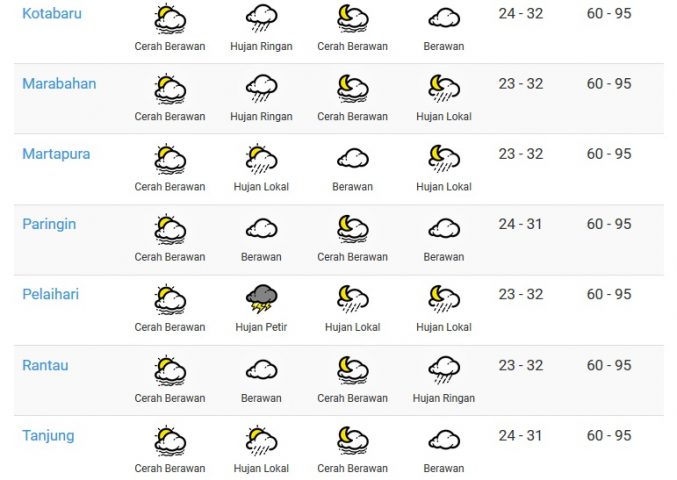 DUTA TV BANJARMASIN – Waspada potensi hujan dengan intensitas sedang hingga lebat yang dapat disertai petir/kilat dan angin kencang di wilayah kabupaten Tanah Laut, Tanah Bumbu, Banjar dan sekitarnya.