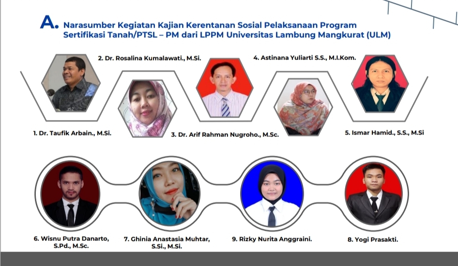 Adapun narasumber kegiatan Kajian Kerentanan Sosial Pelaksanaan Program Sertifikasi Tanah PTSL – PM dari LPPM Universitas Lambung Mangkurat (ULM) atau selaku penliti yakni Dr. Taufik Arbain., M.Si., Dr. Rosalina Kumalawati., M.Si., Dr. Arif Rahman Nugroho., M.Sc., Astinana Yuliarti S.S., M.I.Kom., Ismar Hamid., S.S., M.Si., Wisnu Putra Danarto., S.Pd., M.Sc., Ghinia Anastasia Muhtar., S.Si., M.Si., Yogi Prasakti., Rizky Nurita Anggraini.