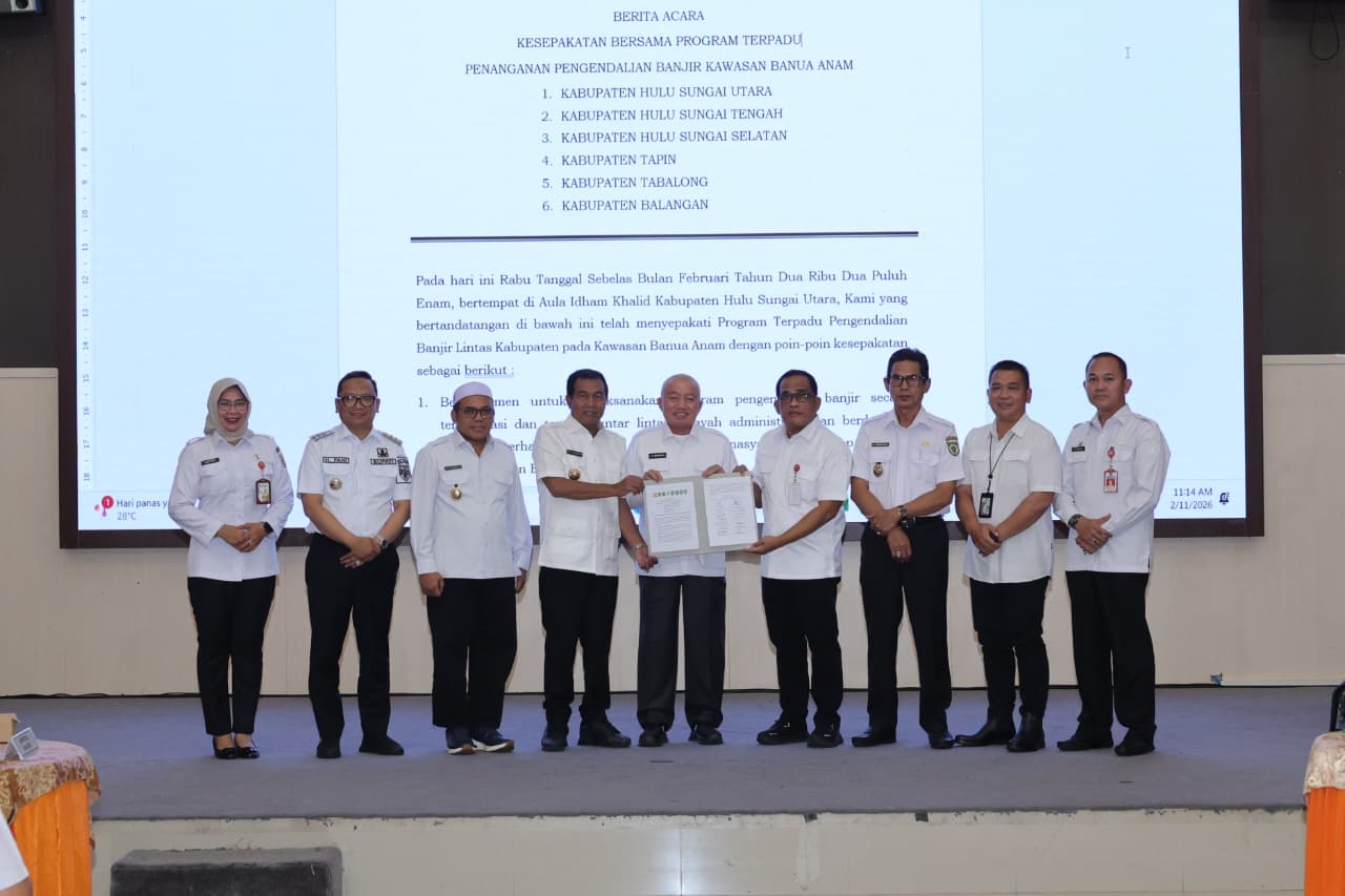 Rapat yang dihadiri langsung oleh Kepala Daerah dari 6 (enam) Kabupaten Banua Anam ini juga dilakukan penandatanganan Berita Acara Kesepakatan Bersama Program Terpadu Penanganan Pengendalian Banjir Kawasan Banua Anam, yang salah satu poinnya adalah komitmen enam kabupaten ini untuk melaksanakan program pengendalian banjir secara terkoordinasi dan terpadu lintas wilayah administrasi guna meminimalisir dampak terhadap sosial-ekonomi masyarakat di kawasan Banua Anam.
