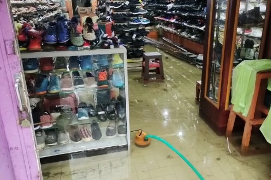 Seperti yang terlihat, air bahkan masuk hingga mencapai mata kaki orang dewasa dan merendam barang barang milik pedagang di dalam toko.