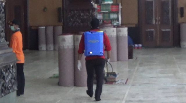 Sementara pada bagian halaman dan atap mesjid dilakukan oleh petugas dari Kodim 1007 Banjarmasin. penyemprotan ini salah satu upaya untuk mencegah penularan Covid-19, terutama dilingkungan atau tempat ibadah, terlebih seperti di Mesjid Jami, yang jemaahnya cukup banyak.